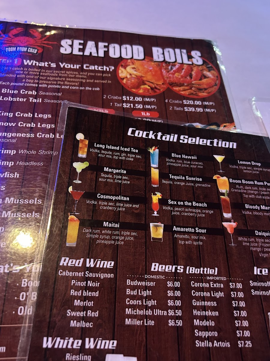 1/2 lb snow crab, 1/2 lb headless shrimp 1/2 Dungeness crab, two eggs, two corns, two potatoes.