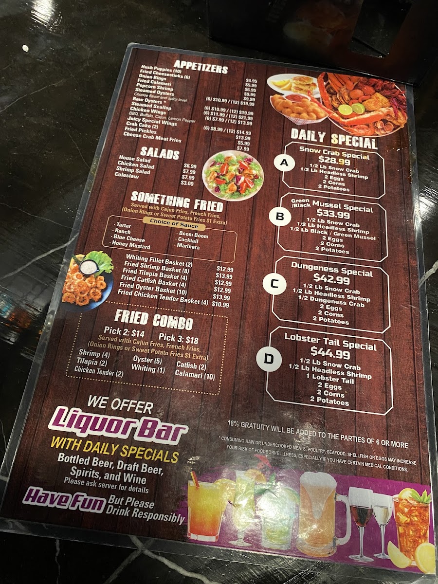 1 lb Snow Crab , 1/2lb Green Mussels, 1/2lb Shrimp( Headless) ,1/2lb Black Mussels 1/2lb Crawfish, 1/2lb Clams 3 egg, 3 corn ,3 potato