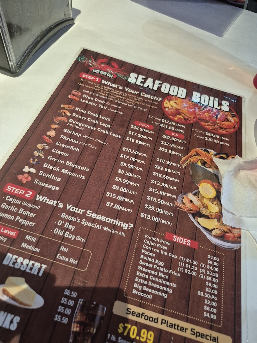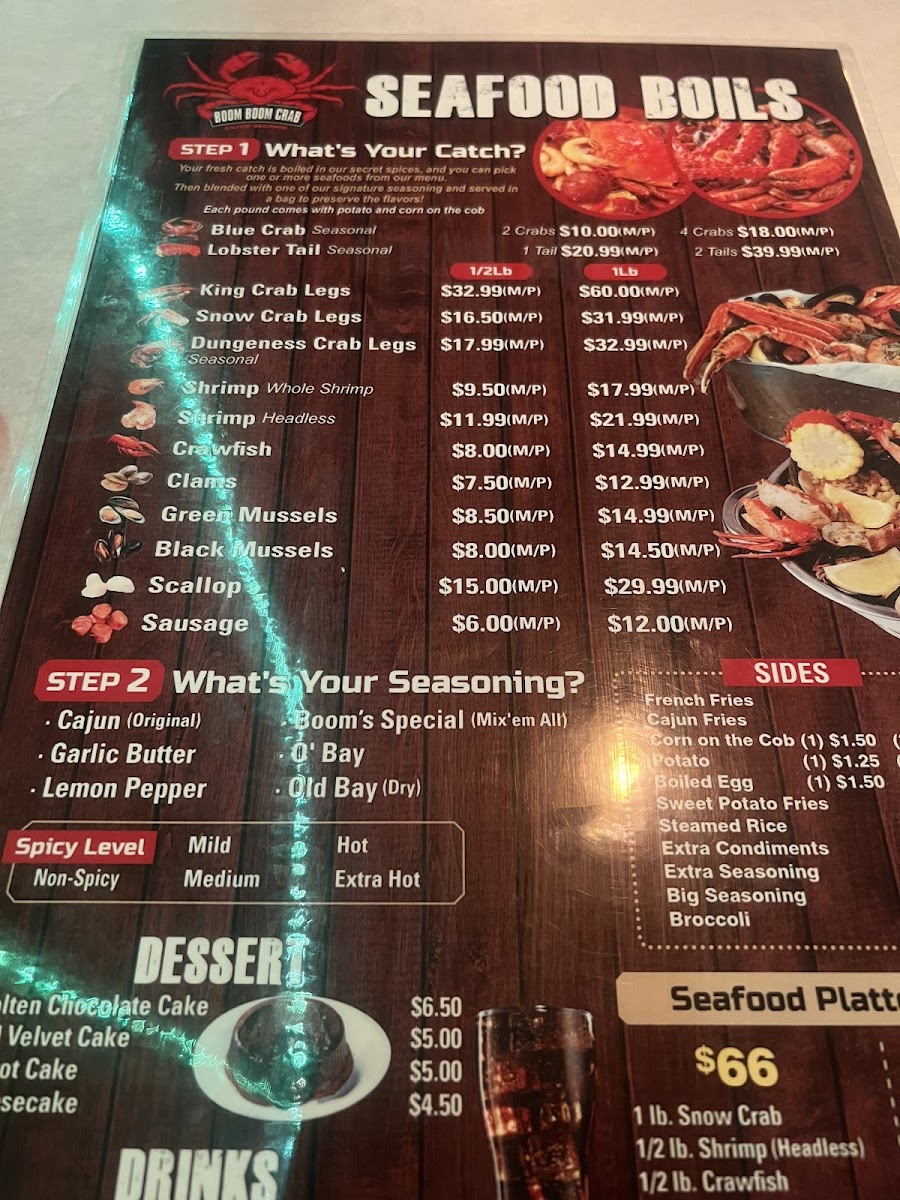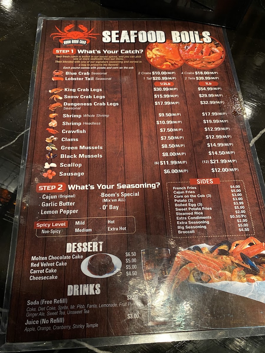 Scallops boil available in 6 or 12 pieces. Flavor options include Cajun original, garlic butter, and lemon pepper. Choose from non-spicy to extra hot. Add-ons include various seafood and sausages.