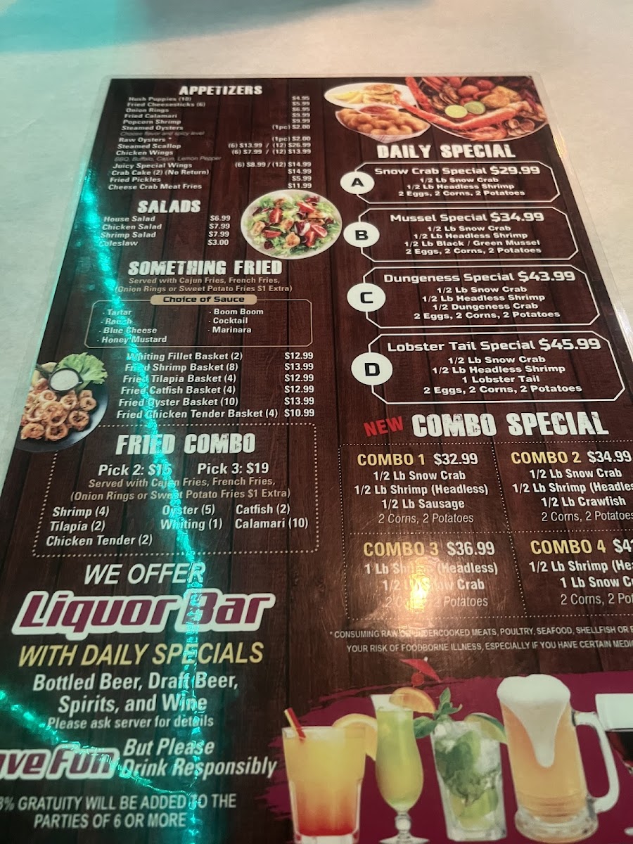 1/2LB Snow Crab 1/2LB Shrimp(Headless) 1/2Lb sausage,2Corn,2Potato